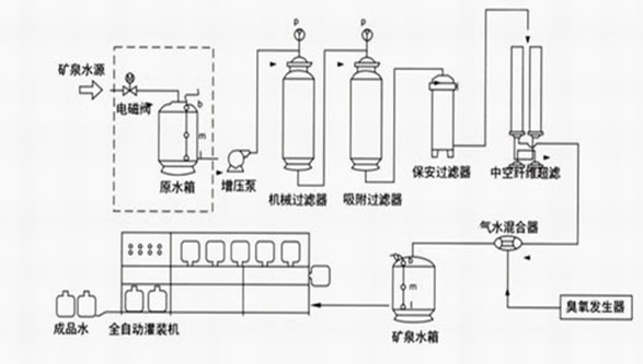 一、純凈水/礦泵水工藝流程 礦泉水廠生產(chǎn)工藝流程圖: 純凈水/礦泉水廠生產(chǎn)工藝流程(圖): a) 原水泵 主要功能:恒定系統(tǒng)供水壓力,穩(wěn)定供水量 。 b) 機(jī)械過濾器 采用多次過濾層的過濾器,主要目的是去除原水中含有的錳、鐵重金屬、泥沙、鐵銹、膠體物質(zhì)、懸浮物等顆粒在20um以上的物質(zhì),系統(tǒng)可以進(jìn)行反沖洗、正沖洗等一系列操作。 主要功能:保證設(shè)備的產(chǎn)水量,延長(zhǎng)設(shè)備的使用壽命。 c) 活性炭過濾器 采用果殼活性炭過濾器,活性炭不但可吸附電解質(zhì)離子,還可以進(jìn)行離子交換吸附。經(jīng)活性炭吸附還可使高錳酸鉀耗氧量(COD)由15mg/L(02)降至2-7mg/L(02),此外由于吸附作用使表面被吸附復(fù)制的濃度增加,因而還起到催化作用,去除水中的色素、異味、大量生化有機(jī)物、降低水的余鹵值及農(nóng)藥污染物和除去水中三鹵化物(THM)以及其他的污染物。系統(tǒng)可以進(jìn)行反沖洗、正沖洗等一系列操作。同時(shí),設(shè)備具有自我維護(hù)系統(tǒng),運(yùn)行費(fèi)用很低。 主要功能:保證設(shè)備的產(chǎn)水質(zhì)量,延長(zhǎng)設(shè)備的使用壽命。 d) 軟化系統(tǒng) 為防止?jié)馑颂貏e是RO裝置最后一根膜組件濃水側(cè)出現(xiàn)CACO3,MGCO3,MGSO4,CASO4,BASO4,SRSO4,SISO4的濃度大于其平衡溶解度常數(shù)而結(jié)晶析出,損壞膜原件的應(yīng)有特性,在進(jìn)入反滲透膜組件之前系統(tǒng)采用鈉型陽(yáng)離子交換樹脂,進(jìn)行離子交換吸附,去除水中主要硬度成分,吸附飽和后,樹脂失效,可用工業(yè)用鹽進(jìn)行再生樹脂,使之恢復(fù)交換能力。 每套軟化系統(tǒng)包括:軟化罐、控制器(或射流器/鹽泵)、鹽箱及鹽閥 主要功能:防止反滲透摸結(jié)垢,延長(zhǎng)反滲透膜的使用壽命。 e) 精密過濾器 精密過濾器用來截留預(yù)處理系統(tǒng)漏過的少量機(jī)械雜質(zhì)。過濾器筒體采用工程塑料或SUS304材質(zhì);內(nèi)裝PPF濾芯。聚丙烯濾芯是一種效率高、阻力小的深層過濾元件。適用于含懸浮雜質(zhì)較低(濁度小于2-5度)的水進(jìn)一步凈化。聚丙烯濾芯由聚丙烯纖維按一定規(guī)律纏繞在注塑聚丙烯多孔管上形成。主要功能:保證進(jìn)入反滲透膜的水顆粒度小于0.1um。 f) 反滲透系統(tǒng) 反滲透裝置是用足夠的壓力使溶液中的溶劑(一般是水)通過反滲透膜(或稱半透膜)而分離出來,因?yàn)檫@個(gè)過程和自然滲透的方向相反,因此稱為反滲透。 反滲透法能適應(yīng)各類含鹽量的原水,尤其是在高含鹽量的水處理工程中,能獲得很好的技術(shù)經(jīng)濟(jì)效益。反滲透法的脫鹽率提高,回收率高,運(yùn)行穩(wěn)定,占地面積小,操作簡(jiǎn)便,反滲透設(shè)備在除鹽的同時(shí),也將大部分細(xì)菌、膠體及大分子量的有機(jī)物去除。 h)設(shè)備工藝流程圖: 原水→原水增壓泵→多介質(zhì)過濾器→活性炭過濾器→離子交換器→保安過濾器→多級(jí)高壓泵→RO反滲透系統(tǒng)→純水箱→全自動(dòng)桶/瓶水灌裝生產(chǎn)線→包裝→入庫(kù) 一、礦泉水生產(chǎn)工藝流程圖: