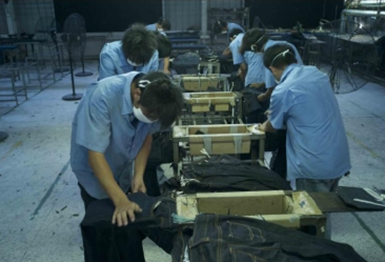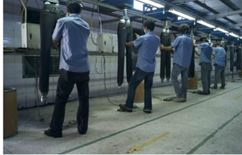 三:臭氧氧化與傳統方法的優缺點比較 1. 用次氯酸鈉(婆梅度為18度)經濟;不好控制,有傷布的纖維。健康危害:經常用手接觸本品的工人,手掌大量出汗,指甲變薄,毛發脫落。本品有致敏作用。本品放出的氯氣有可能引起中毒。具腐蝕性,可致人體灼傷,具致敏性。 2. 用亞氯酸鈉和硫酸在加次氯酸鈉。價格比上一種高點。但比上一種好點。不傷布的纖維。亞氯酸鈉有強氧化性。在175℃時即分解而發熱,與可燃物質接觸,即起猛烈爆炸,須注意安全。硫酸對環境有危害,對水體和土壤可造成酸性污染。具強腐蝕性、強刺激性,可致人體灼傷。 3. 高錳酸鉀、過醋酸和還原漂白方式 關于牛仔布漂白,除了用次氯酸鈉和亞氯酸鈉外,還可以用高錳酸鉀、過醋酸和還原漂白方式,具體需要根據牛仔布所用染料類型來選擇,傳統牛仔為還原淀籃染料,也有用硫化染料或直接染料代替,也有采用活性染料代替的,故此,需要根據具體情況考慮。 4. 臭氧氧化的優點 a) 無污染,臭氧為純凈物。在常溫下,易分解,生成氧氣和氧原子 b) 臭氧的氧化能力極強。 c) 運行成本低 四:手工處理 1.手擦 a) 在洗水前,通過使用砂輪滾動摩擦而使布面染料褪色,手擦的地方通常是脾位和臀位,人為的機械褪色,讓牛褲在洗水后顯得自然地懷舊和泛白 b) 噴沙和手擦效果接近,但對布紋的效果有差別。噴沙后布紋模糊,沉底,而手擦后布紋清晰凸顯